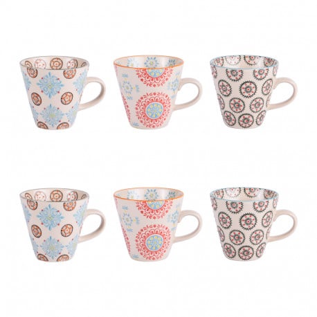 Coffret de 6 tasses Bohème 17 cl. La collection Bohème de Table Passion séduit par ses associations de couleurs lumineuses et son style à la fois artistique et chaleureux. Entièrement peintes à la main et réalisées en grès artisanal, ces tasses reflètent un véritable savoir-faire et rendent chaque pièce unique.